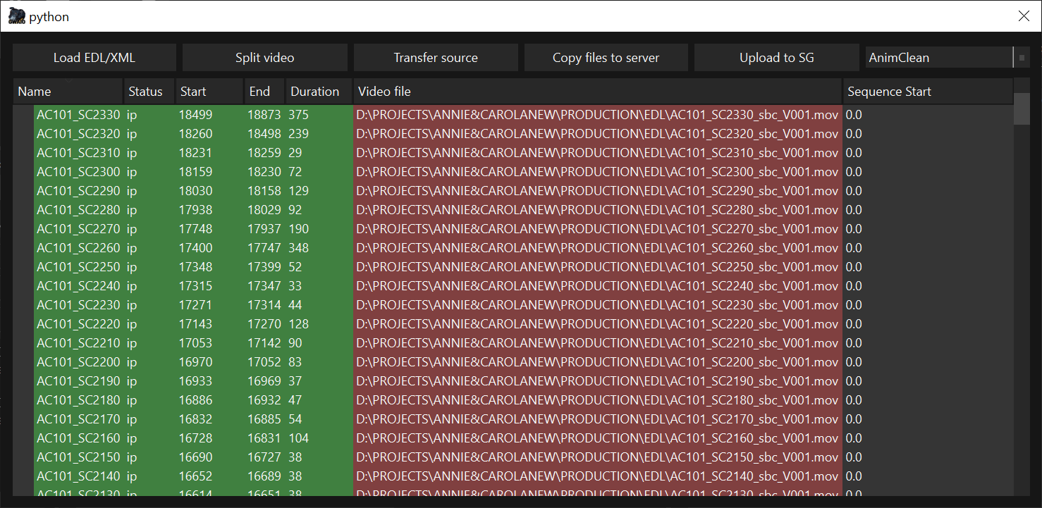 - Split video: Con los datos cargados, podemos utilizar esta botón para recortar los shots del video dado. A través de los datos de la EDL GwaIO recortará los shots seleccionados en la ventana y los guardará en formato mov y wav.