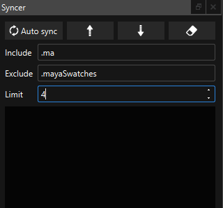 En este panel podemos configurar una serie de filtros para que el sincronizador excluya ciertos ficheros o fuerce a sincronizar algun fichero en concreto, además se puede limitar la cantidad de archivos a sincronizar. * Include: Sincroniza unicamente los archivos que contiene el texto del recuadro. * Exclude: Excluye del sincronizado los archivos que contiene el texto del recuadro. * Limit: Limita el numero de archivos sincronizados. Este limite se aplica por extensión de los archivos. Es decir, si existe para sincronizar 4 archivos .ma y 4 archivos .mov y ponemos un limite de 2, se sincronizarán los 2 últimos .ma y los dos últimos .mov.