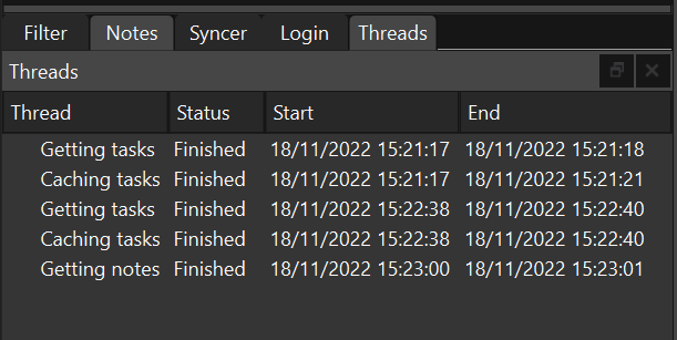 Panel técnico donde se muestra el listado de todos los hilos de proceso abiertos, finalizados y a la espera en el programa. No es relevante para el usuario.